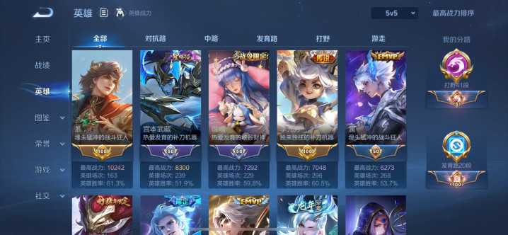 当然了,这位玩家之所以皮肤数量比较少,主要还是因为她在认真玩王者荣耀。我们可以看到,该玩家的英雄主页中,大部分都是打野英雄,并且还获得了不少省标市标,比如说暃、李元芳、嫦娥和宫本武藏,打野分路段位更是有41段,作为女玩家还是不错的哦。各位玩家们,这个王者荣耀账号你们觉得这个八字ID价值多少马内呢?如果是你的话,会不会为了这个ID而入手这个账号呢,记得有什么想说的话,在留言区跟我交流沟通哈。