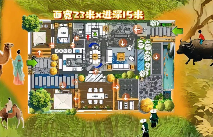 把诸多装饰元素,双玄关、双门、动线、天井、茶台、花园、四合院元素、情感价值、人性化设计、融合成一体!